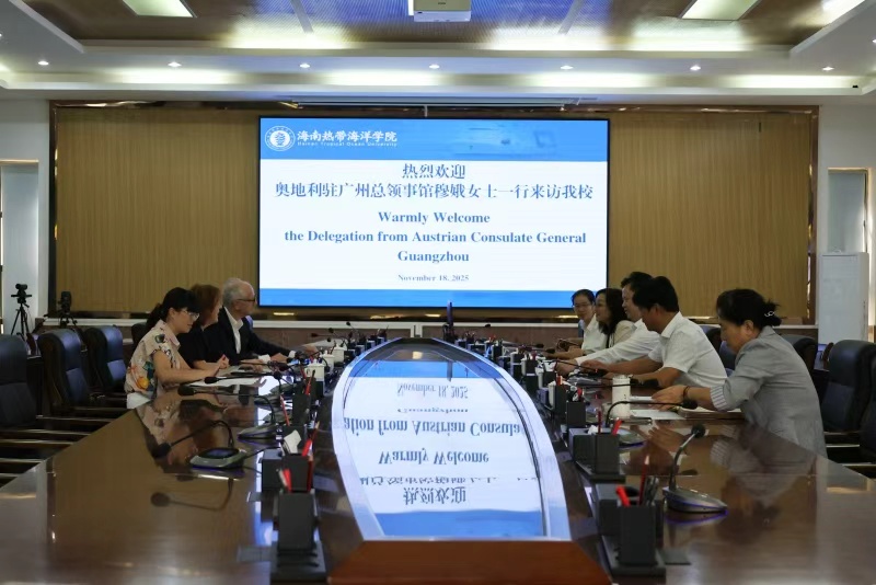 11月18日,奥地利驻广州总领事馆商务领事兼代馆长穆娥一行来校调研交流,双方在三亚校区行政楼217会议室围绕青年人才国际化培养、教育交流合作等议题进行专题座谈,校党委常委、副校长杨学前主持会议。
