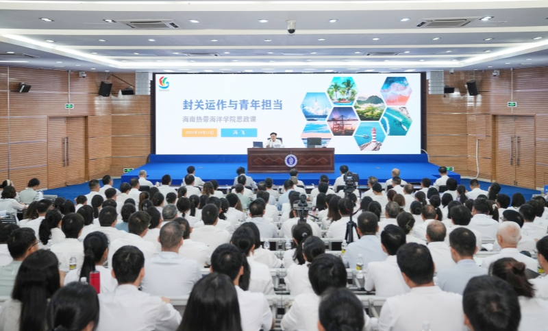 2025年10月15日上午,省委书记冯飞走进我校,以《封关运作与青年担当》为题,向全省高校师生代表讲授思政课,同时也对学校发展寄予了殷切希望,指出省里将支持热海院建成全国一流的海洋大学,也希望学校扛起全省“向海图强”的责任担当。冯飞书记的这堂思政课为广大师生深刻领悟习近平新时代中国特色社会主义思想的真理力量和实践伟力提供了鲜活教材。