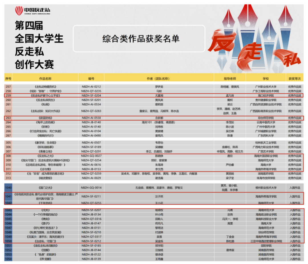 近日,第四届全国大学生反走私创作大赛获奖名单正式公布,海南热带海洋学院师生作品斩获8项全国级奖项,其中全国艺术设计类优秀奖2项、入围奖2项,全国综合类优秀奖1项、入围奖2项,全国视频类入围奖1项。