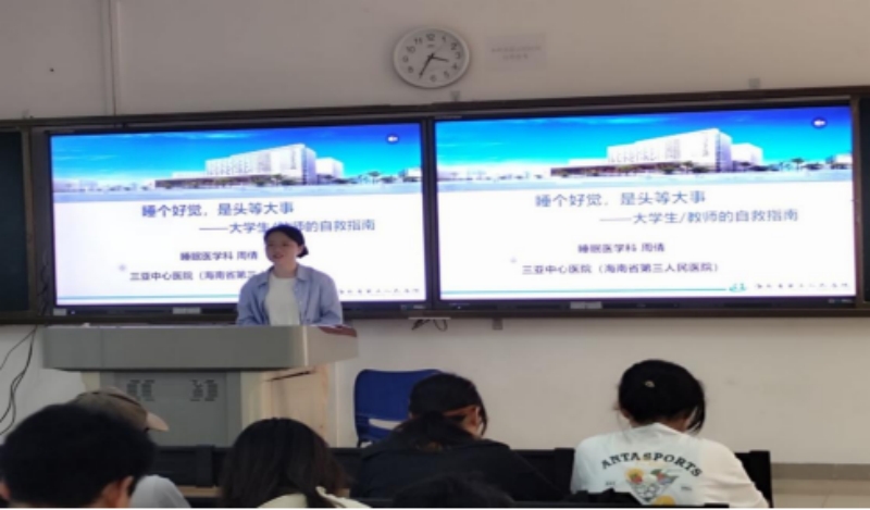 讲座中,三亚中心医院睡眠医学科周倩医生围绕“睡个好觉,是头等大事”主题展开系统讲解。她通过现场提问与互动调查,精准了解在场学生的睡眠现状,并针对“熬夜补觉”“睡前刷手机无害”“打鼾即睡得香”等常见认知误区进行逐一纠偏,帮助学生建立科学的睡眠认知体系。为增强参与感与自我筛查能力,讲座播放了睡眠障碍科普视频,并发放了标准化睡眠自评量表,引导学生对照自身情况进行初步评估。在睡眠障碍干预环节,周倩医生带领学生现场体验“正念呼吸”与“身体扫描”两项循证心理疗法,传授无需药物、可随时应用的自我调节技术。最后,她系统归纳了营造优质睡眠环境的实用技巧,包括光照控制、温度调节、睡前仪式建立等,并郑重提醒学生:若长期存在入睡困难、早醒、日间功能受损等问题,应及时寻求专业医疗帮助。本环节有效纠正了学生的睡眠认知偏差,提升了自我筛查与调适能力,取得了良好的科普与干预效果。